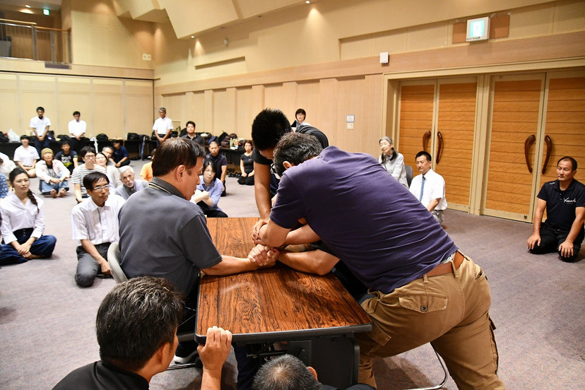 講義実践では、宇城道塾で展開する様々な検証が次々に行なわれ、筋力による対立の力と調和の力の桁違いな差や、子どもの持つぶつからない力、呼吸法で身体をひとつにすることからくる力をはじめ、目に見えないけれど、確実に存在し身体に変化を与える気など、これまでの常識的な「力」の概念とはまったく異なる「エネルギー」を参加者は体験していきました。