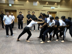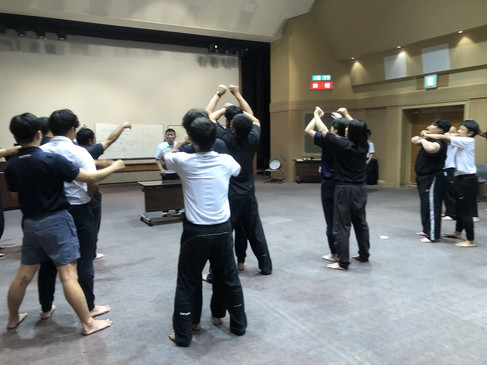 実践では、事前に試聴した動画同様にスクラムを組んだ人を押して倒すことをしましたが、力だけの衝突・対立では倒すことはできず、宇城先生が気を通されるとスクラムは簡単に崩れます。私たちが再度実践する際には、体調不良の方に寄り添い声をかけてから押すと崩すことができました。
