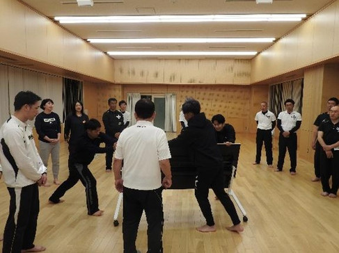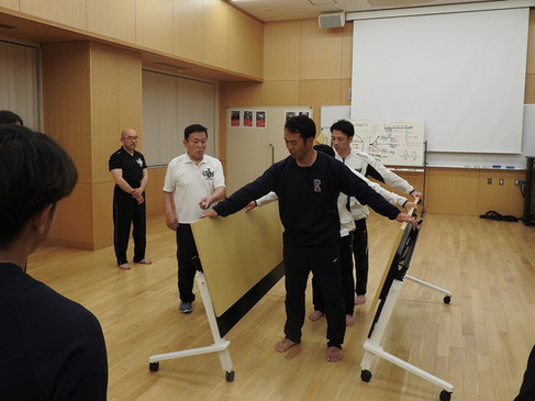 椅子に座った自分を抑えられると全く身動きができませんでしたが、先生に気を通してもらうと簡単に動かすことができました。抑えている人たちも先生が導く方向にグルグルと回り出し、その勢いは人数が増えれば増えるほど大きくなっていきました。人が多ければ頭では、『この人数はさすがに無理だ』と勝手に決めつけてしまう思考と身体になっていることに気づきました。それは2対3の帯引きでも同様です。人数が多い方が勝つという根拠のない要因が頭に浮かんできてしまう…ダメな方で身についてしまっているものはなかなか抜けません。